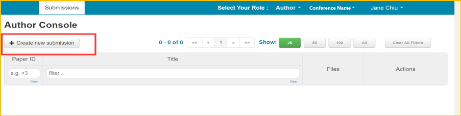 I. Then you will enter the“Author Console” page, click on “ Create new submission” button